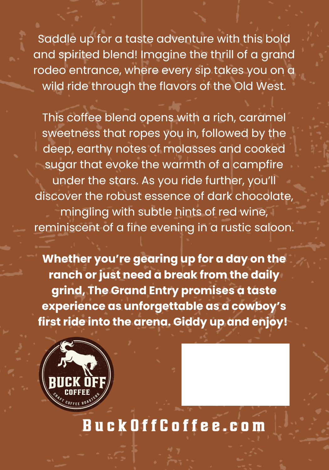 Saddle up for a taste adventure with this bold and spirited blend! Imagine the thrill of a grand rodeo entrance, where every sip takes you on a wild ride through the flavors of the Old West.